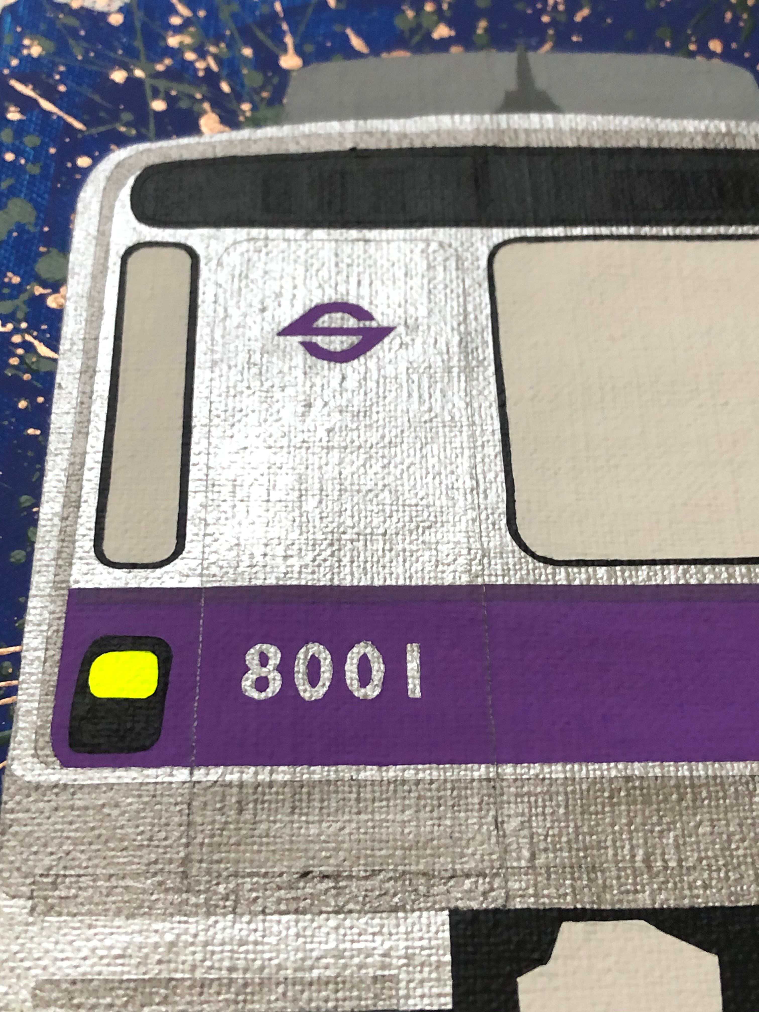 キャンバスにアクリル絵具で下地を塗り、車両部分は更にキャンバスに描いた車両を貼り付けています。